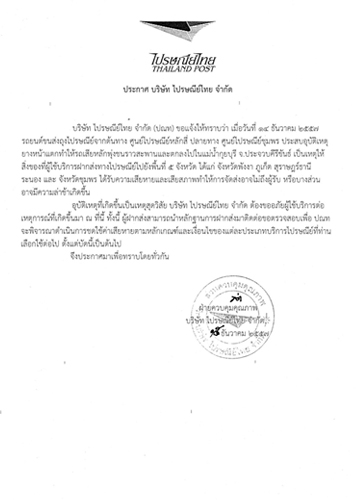 อย่างไรก็ตาม ผู้ใช้บริการสามารถนำหลักฐานการฝากส่งมาติดต่อขอตรวจสอบได้ตั้งแต่บัดนี้ ณ ที่ทำการไปรษณีย์ต้นทางที่ฝากส่ง เพื่อไปรษณีย์ไทย จะดำเนินการชดใช้ค่าเสียหายตามหลักเกณฑ์และเงื่อนไขของประเภทบริการไปรษณีย์ต่อไป ทั้งนี้ สามารถสอบถามข้อมูลเพิ่มเติม ได้ที่ THP Contact Center 1545
