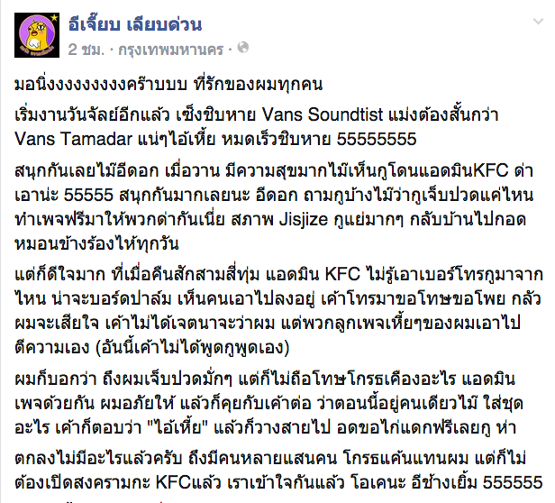แต่ก็ดีใจมาก ที่เมื่อคืนสักสามสี่ทุ่ม แอดมิน KFC ไม่รู้เอาเบอร์โทรกูมาจากไหน น่าจะบอร์ดปาล์ม เห็นคนเอาไปลงอยู่ เค้าโทรมาขอโทษขอโพย กลัวผมจะเสียใจ เค้าไม่ได้เจตนาจะว่าผม แต่พวกลูกเพจเหี้ย ๆ ของผมเอาไปตีความเอง (อันนี้เค้าไม่ได้พูดกูพูดเอง)