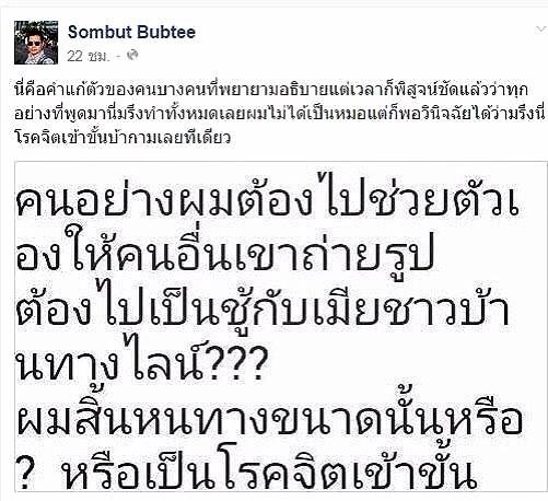 ผมโพสต์เพจที่ Sombut Bubtee กล่าวหาลงเป็นตัวอย่าง เพื่อให้ท่านใดก็ตามที่เป็นเพื่อน หรือรู้จักคนเหล่านี้ จะได้รู้ว่าพวกเขามีพฤติกรรมเช่นนี้ ในขณะที่ช่วงนั้น มีข่าวเรื่องคลิป เรื่อง Line และมีเพื่อนในเฟซบุ๊กไปอ่านเจอเข้า ทุกคน "รู้ทันที" ว่า เขาหมายถึงผม ทุกคนพร้อมจะเป็นพยานให้ วันนี้ศาลนัดวันไต่สวนเรื่องนี้แล้วครับ