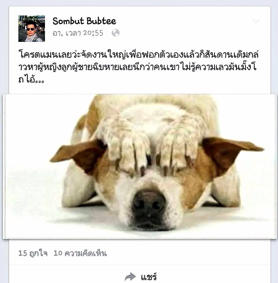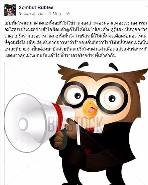 โดยมีเพื่อน ๆ ในเฟซบุ๊กของนาย Sombut Bubtee ประมาณ 6-7 คน คอยแสดงความเห็น และด่าด้วยข้อความ "ต่ำช้ามาก" เช่น Starlet Blue, Na Rojanaprapa, Suraphan Forthhouse, Ann Atcharaporn, Bumusa Bumbim, สุดฤทธิ์วิภา บ้าสุดสุด, Pimploy Polyaim ...