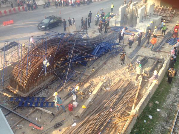 17.28น.นั่งร้านก่อสร้างรถไฟฟ้าสายสีแดง ทรุดตัวหน้าITสแควร์ เจ็บ8 สาหัส 3 ภาพจาก Twitter @js100radio