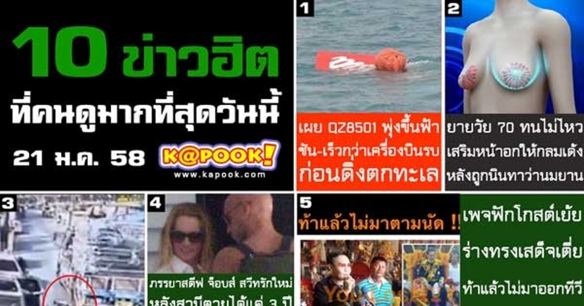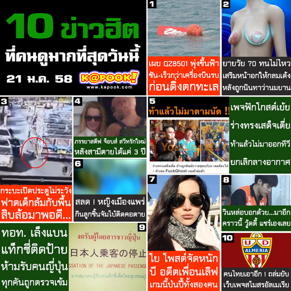 ข่าวฮิตประจำวันที่ 21 มกราคม 2558 เป็นเรื่องความคืบหน้าของเครื่องบินแอร์เอเชีย อินโดนีเซียตก ซึ่งสาเหตุคาดดว่าน่าจะทะยานขึ้นฟ้าชัน นอกจากนี้ ยังมีข่าวคุณยายเสริมหน้าอก และอื่นๆ ที่น่าสนใจอีกมาก มีข่าวอะไรบ้าง ดูได้ด้านล่างเลย