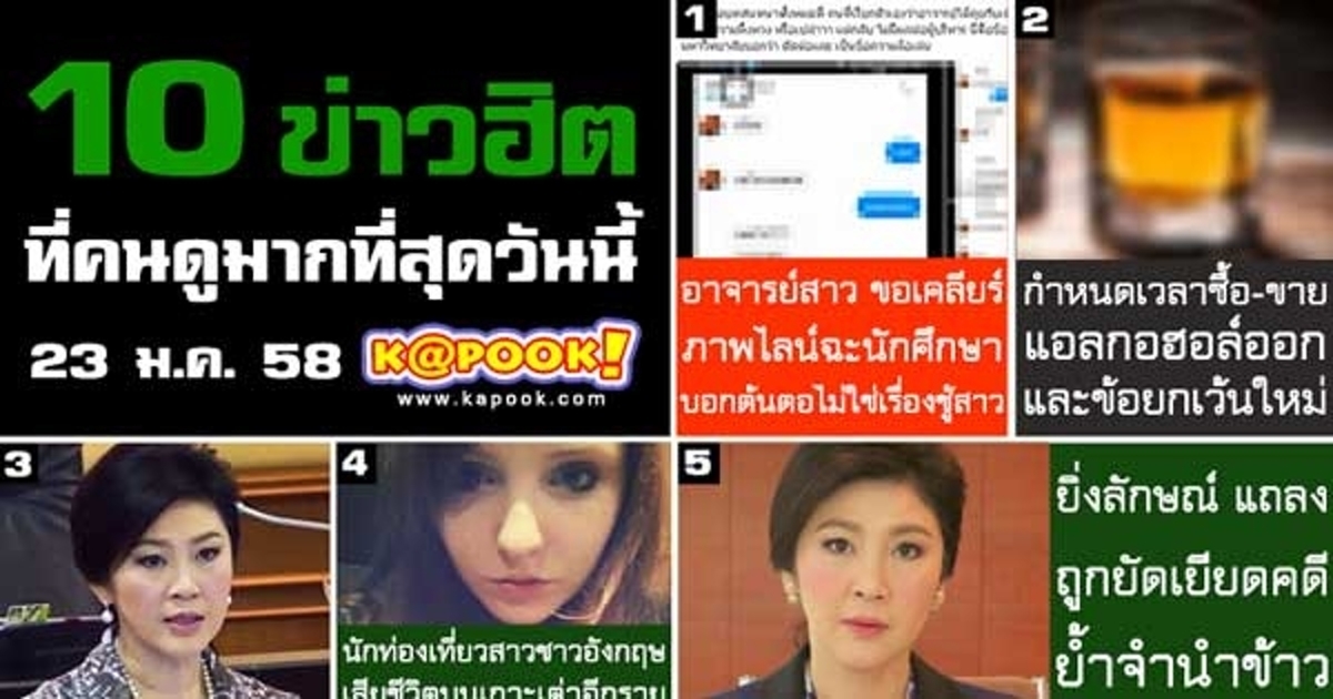 ข่าวฮิตประจำวันที่ 23 มกราคม 2557 เป็นเรื่องของ ยิ่งลักษณ์ ชินวัตร ถูกตัดสิทธิ์ทางการเมือง 5 ปี รองลงมาเป็นเรื่อง อาจารย์สาว ขอเคลียร์ภาพหลังไลน์นักศึกษาหลุด ส่วนข่าวอื่น ๆ มีอะไรบ้าง ตามลิงก์ด้านล่างเลย