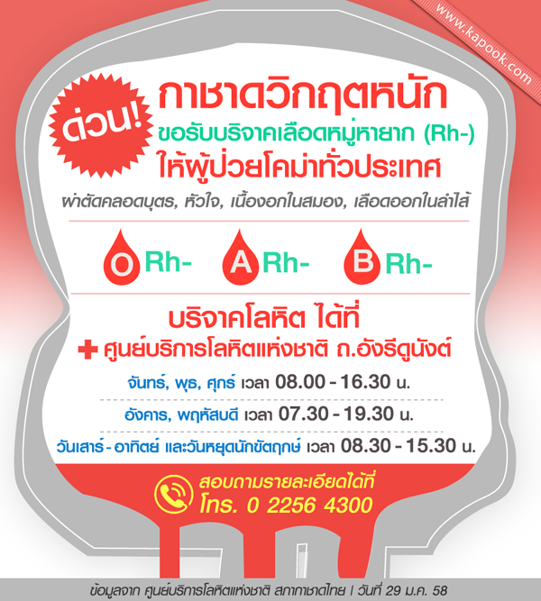กาชาดวิกฤต ไม่มีเลือดหมู่หายาก (Rh-) จ่ายให้ผู้ป่วยโคม่าผ่าตัดด่วน! (สภากาชาด)