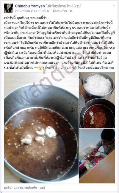 1. การโพสต์ภาพขอความช่วยเหลือ เป็นการโพสต์ของครูพี่เลี้ยงของโรงเรียน ที่มีความรู้สึกสงสารนักเรียน ที่ในวันนั้นนำข้าวมาทานกับพริกน้ำปลา จึงได้ถ่ายภาพไว้ และขอความช่วยเหลือจากเพื่อน ๆ ที่เป็นศิษย์เก่า (ตามภาพ โพสต์ต้นฉบับ) และเนื่องจากมีผู้เห็นภาพชุดนี้ เกิดเมตตาสงสาร จึงช่วยกระจายข่าวเพิ่มเติม