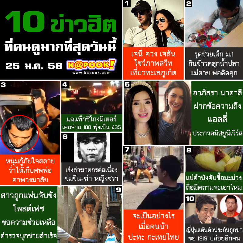 ข่าวฮิตประจำเว็บไซต์กระปุกดอทคอม ประจำวันที่ 25 มกราคม 2558 เรื่องที่คนสนใจมากที่สุดวันนี้เป็นภาพของสาวเจนี่ เทียนโพธิ์สุวรรณ ที่ควงเพื่อนหนุ่ม เจสัน ไปเที่ยวทะเลภูเก็ต เอ...แต่เขียนข้อความหวานเว่อร์เกินเพื่อนหรือเปล่านะ ^^