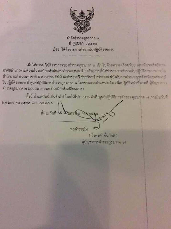 เมื่อวันที่ 27 มกราคม 2558 ผู้สื่อข่าวรายงานว่า พล.ต.ท. วีรพงษ์ ชื่นภักดี ผู้บัญชาการตำรวจภูธรภาค 7 ได้มีคำสั่งให้ พล.ต.ต. ชัชชรินทร์ สว่างวงศ์ ผู้บังคับการตำรวจภูธรจังหวัดสุพรรณบุรี ไปปฏิบัติราชการที่ศูนย์ปฎิบัติการตำรวจภูธรภาค 7 ลงวันที่ 26 มกราคม 2558 มีผลนับตั้งแต่บัดนี้เป็นต้นไป จนกว่าจะมีคำสั่งเปลี่ยนแปลง พร้อมให้ไปรายงานตัวกับ พล.ต.ต. ชนาภัทร เชยสมบัติ รองผู้บัญชาการตำรวจภูธรภาค 7 เวลา 08.30 น. วันที่ 27 มกราคม 2558 และมีคำสั่งให้ พ.ต.อ. ชัยรัตน์ ทิพยจันทร์ รองผู้บังคับการตำรวจภูธรจังหวัดสุพรรณบุรี ซึ่งลำดับอาวุโสสูงสุดการรักษาราชแทน