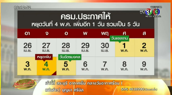 วันที่ 29 มกราคม 2558 รายการเรื่องเล่าเช้านี้ ทางช่อง 3 รายงานว่า หลังจากที่คณะรัฐมนตรีมีมติประกาศเพิ่มวันหยุดพิเศษในวันจันทร์ที่ 4 พฤษภาคม 2558 เป็นช่วงวันหยุดยาว 5 วัน ตั้งแต่วันศุกร์ที่ 1 พฤษภาคม ซึ่งตรงกับวันแรงงาน ต่อเนื่องถึงวันที่ 5 พฤษภาคม ซึ่งตรงกับวันฉัตรมงคล เพื่อกระตุ้นเศรษฐกิจการท่องเที่ยวนั้น ทำให้หลายคนเริ่มวางแผนท่องเที่ยวกันแล้ว