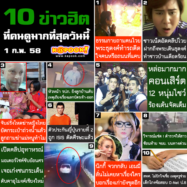 10 ข่าวฮิต เว็บไซต์ kapook.com ประจำวันที่ 1 กุมภาพันธ์ 2558