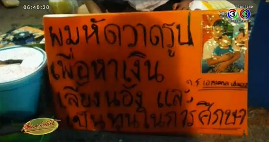 วันนี้ (2 กุมภาพันธ์ 2558) รายการเรื่องเล่าเช้านี้ ช่อง 3 ได้รายงานข่าวของเด็กชายคนหนึ่ง เรียนอยู่ชั้น ป.5 มานั่งวาดรูปและประดิษฐ์ดอกไม้ขาย ที่ตลาดเทพประสิทธิ์ พัทยา เพื่อหาเงินมาช่วยเหลือบิดาซึ่งพิการจากอุบัติเหตุจากการทำงาน