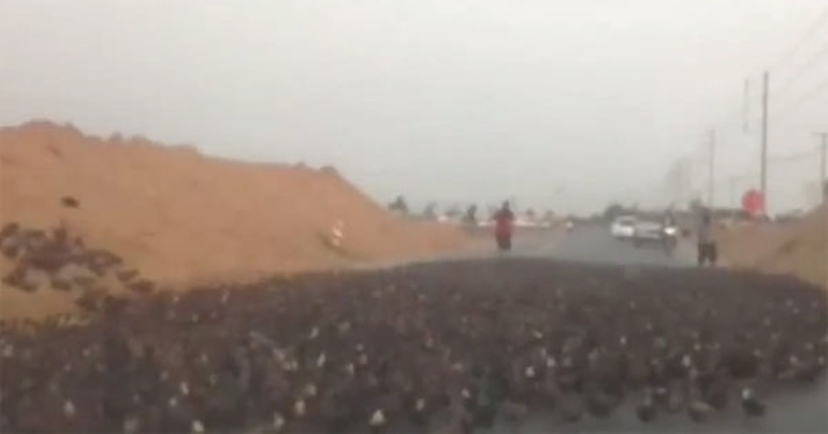 ฝูงเป็ดไล่ทุ่งนับหมื่นตัว เดิมข้ามถนนที่จังหวัดพระนครศรีอยุธยา แต่ข้างทางเป็นไซต์ก่อสร้าง ทำให้ต้องใช้เวลานาน สร้างสีสันบนท้องถนนให้กับผู้ใช้รถใช้ถนน