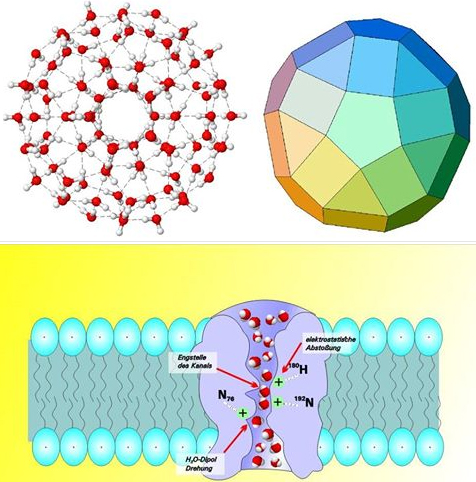 แต่จริง ๆ แล้ว น้ำไม่ได้เข้าสู่เซลล์ในรูปของกระจุก แต่จะเข้าไปในเซลล์ทีละ 1 โมเลกุล เรียงกันไปด้วยอัตราเร็วที่สูงมากๆๆๆ ผ่านช่องอะควอพอริน aquaporin channel ที่เยื่อหุ้มเซลล์อยู่แล้ว (ดูรูปล่าง) ... ดังนั้น การอ้างเรื่องกระจุกน้ำเล็กลง (ถึงทำได้) ก็ไม่ได้จะแตกต่างอะไรกับน้ำทั่วไป