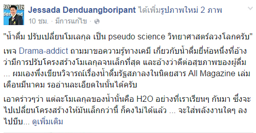 หลังจากที่เพจเฟซบุ๊กชื่อดังอย่าง Drama-addict ได้โพสต์ข้อความถามไปยัง ผู้ช่วยศาสตราจารย์ ว่าที่ร้อยตรี ดร.เจษฎา เด่นดวงบริพันธ์ อาจารย์ประจำภาควิชาชีววิทยา คณะวิทยาศาสตร์ จุฬาลงกรณ์มหาวิทยาลัย ถึงความเป็นได้ที่โมเลกุลของน้ำจะเรียงเป็นเส้นตรง จากกรณีที่มีน้ำดื่มยี่ห้อหนึ่งได้แอบอ้างสรรพคุณว่า น้ำดื่มที่มีโมเลกุลเล็กที่สุดเป็นน้ำที่ดีที่สุดสำหรับร่างกายมนุษย์นั้น