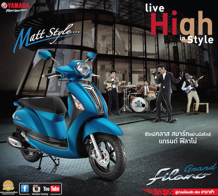 ยามาฮ่า แกรนด์ ฟีลาโน่ ... ชีวิตมีคลาส สมาร์ทอย่างมีสไตล์ ออโตเมติกพรีเมี่ยมหัวฉีด 125 ซีซี พร้อมเทคโนโลยีเครื่องยนต์ BLUE CORE ให้สมรรถนะและความประหยัดสูงสุดถึง 60 กม./ลิตร สะดวกสบายด้วยฟังค์ชั่นฉลาดรอบคัน ดีไซน์ ทันสมัย สไตล์เรียบหรู บ่งบอกชีวิตที่มีคลาส สมาร์ทอย่างมีสไตล์
