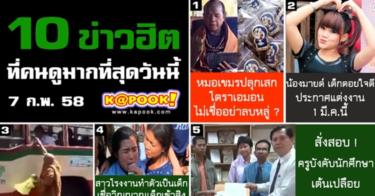 10 ข่าวฮิต เว็บ kapook.com ประจำวันที่ 7 กุมภาพันธ์ 2558