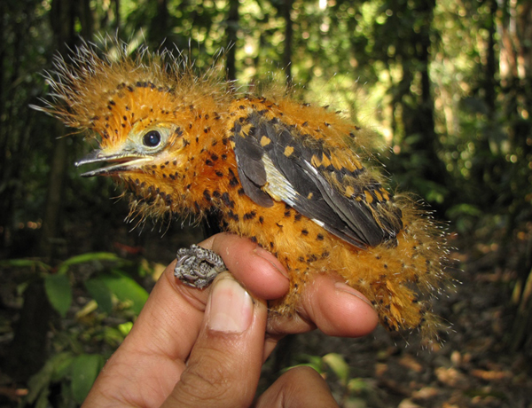 เจ้าลูกนกตัวนี้เป็นนกสายพันธุ์ Laniocera hypopyrra ที่อาศัยอยู่ในป่าอะเมซอน มันมีลักษณะขนปุกปุยราวกับหนอนขนที่มีพิษ อย่างไรก็ดี ลักษณะเช่นนี้จะเป็นเฉพาะช่วงที่เจ้านกยังเล็ก ไม่สามารถบินและช่วยเหลือตัวเองได้เท่านั้น ถ้ามันเติบโตขึ้นก็จะมีลักษณะที่แตกต่างจากเดิมไปเลย