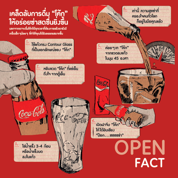 ถึงจะถูกรีดีไซน์ไปตามยุคบ้าง แต่ทรงโค้งและเว้าอย่างพอเหมาะพอดีของขวดที่เรียกกันว่า Contour Bottle ก็ยังคงเป็นเอกลักษณ์ของโค้กเสมอมา โดยเจ้าขวดแก้วทรงโค้งนี้เองที่สามารถเก็บความเย็นสดชื่นของโค้กให้อร่อยซ่าไว้ได้อย่างดีที่สุด ว้าว !! รู้แล้วก็ต้องลองหยิบโค้กขวดแก้วแช่เย็นสุด ๆ มาเทใส่น้ำแข็งดื่ม อาห์...แล้วจะรู้เลยว่า ความอร่อยซ่าตัวจริงน่ะเลียนแบบกันไม่ได้จริง ๆ