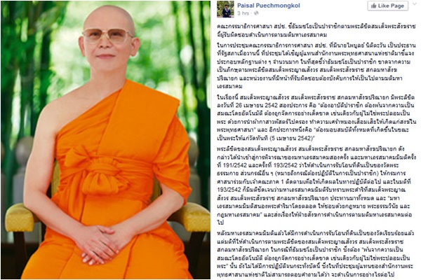 วันที่ 18 กุมภาพันธ์ 2558 นายไพศาล พืชมงคล อดีตสมาชิกวุฒิสภาและอดีตสมาชิกสภานิติบัญญัติแห่งชาติ ได้โพสต์ข้อความลงในเฟซบุ๊กส่วนตัว Paisal Puechmongkol เปิดเผยถึงการประชุม ณ รัฐสภา ของคณะกรรมาธิการการศาสนา สภาปฏิรูปแห่งชาติ (สปช.) เมื่อวันที่ 17 กุมภาพันธ์ ที่ผ่านมา ที่มี นายไพบูลย์ นิติตะวัน เป็นประธาน ว่า ผู้แทนสำนักงานพระพุทธศาสนาแห่งชาติ ได้เข้าชี้แจงในที่ประชุมว่า ตามลิขิตสมเด็จพระญาณสังวร สมเด็จพระสังฆราช สกลมหาสังฆปริณายก ซึ่งมีพระลิขิตลงวันที่ 26 เมษายน 2542 นั้น ชี้ชัดว่า พระเทพญาณมหามุนี (ไชยบูลย์ ธมฺมชโย) เจ้าอาวาสวัดธรรมกาย และประธานมูลนิธิธรรมกาย นั้นเป็นปาราชิกขาดจากความเป็นภิกษุ เนื่องจากการนำผ้ากาสาวพัสตร์ไปครอง ทำความเศร้าหมองเสื่อมเสียให้เกิดแก่สงฆ์ในพระพุทธศาสนา โดยพระเทพญาณมหามุนีนั้น ต้องมอบสมบัติทั้งหมดที่เกิดขึ้นขณะเป็นพระให้แก่วัด อย่างไรก็ดี มหาเถรสมาคมก็ได้มีมติรับทราบพระลิขิตดังกล่าวแล้ว