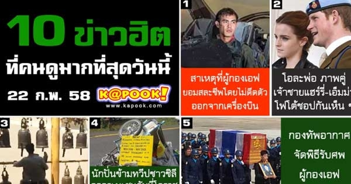 ข่าวฮิตวันนี้ เป็นประเด็นต่อเนื่องจากผู้กองเอฟเสียชีวิต นอกจากนี้ยังมีเรื่องเอ็มม่า วัตสัน กับเจ้าชายแฮร์รี่ สรุปเป็นภาพตัดต่อ ส่วนข่าวอื่นมีอะไรอีก ตามลิสต์ด้านล่างเลยจ้า