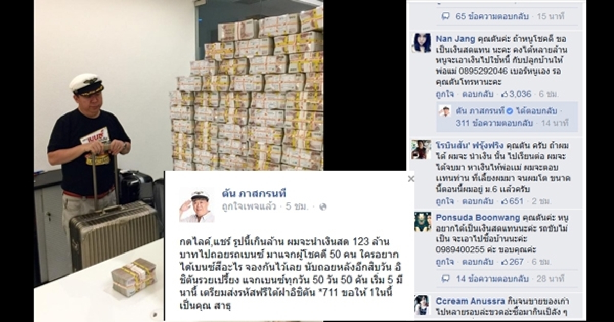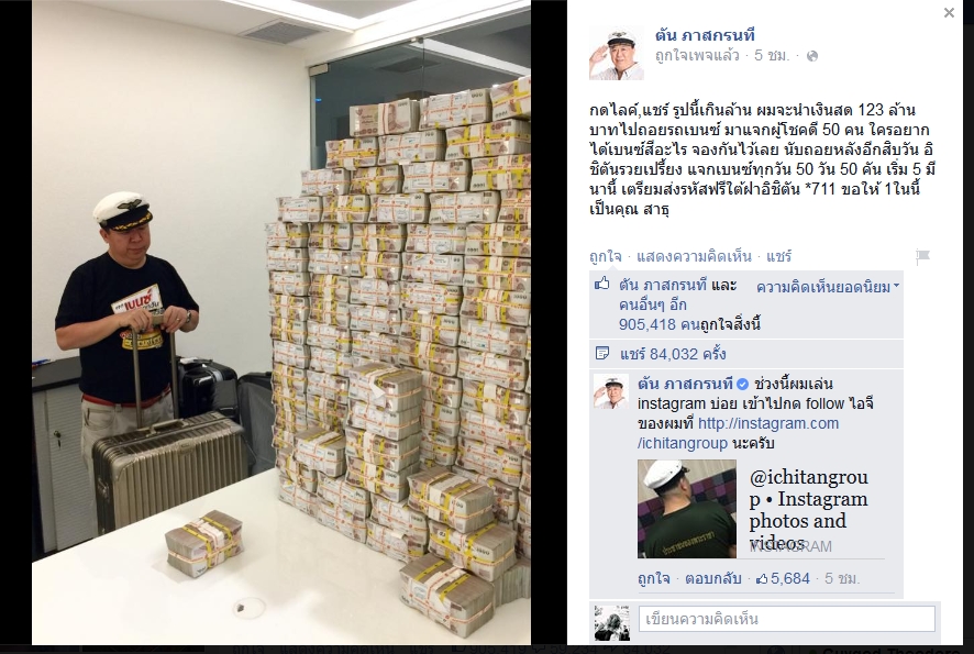 กดไลค์, แชร์ รูปนี้เกินล้าน ผมจะนำเงินสด 123 ล้านบาทไปถอยรถเบนซ์ มาแจกผู้โชคดี 50 คน ใครอยากได้เบนซ์สีอะไร จองกันไว้เลย นับถอยหลังอีกสิบวัน อิชิตันรวยเปรี้ยง แจกเบนซ์ทุกวัน 50 วัน 50 คัน เริ่ม 5 มีนานี้ เตรียมส่งรหัสฟรีใต้ฝาอิชิตัน *711 ขอให้ 1 ในนี้เป็นคุณ สาธุ