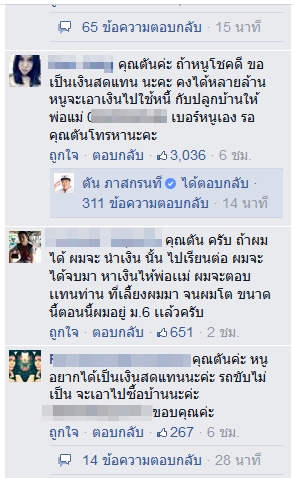 คุณตัน ครับ ถ้าผมได้ ผมจะ นำเงิน นั้น ไปเรียนต่อ ผมจะได้จบมา หาเงินให้พ่อแม่ ผมจะตอบแทนท่าน ที่เลี้ยงผมมา จนผมโต ขนาดนี้ตอนนี้ผมอยู่ ม.6 แล้วครับ