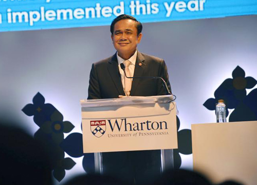 ผู้สื่อข่าวรายงานว่า วันเดียวกันนี้ได้มีการประชุมระดับโลกวอร์ตัน เอเชียในยุคที่โลกไร้พรมแดน Wharton University of Pennsylvania ซึ่ง พล.อ. ประยุทธ์ ได้กล่าวตอนหนึ่งเพื่อให้ทุกประเทศ โดยเฉพาะสหรัฐอเมริกา เข้าใจถึงสถานการณ์ที่เกิดขึ้นในประเทศ และเปรียบเทียบว่าการแก้ปัญหาในแต่ละที่ไม่สามารถใช้วิธีการเดียวกันได้ แต่ด้วยความช่วยเหลือของสหรัฐอเมริกาจะทำให้คนทั้งโลกมีความสุข อีกทั้งนายกรัฐมนตรียังได้ระบุถึงความจำเป็นในการเข้ามาควบคุมอำนาจว่า ไม่ได้ทำให้ใครเดือดร้อน หรือละเมิดสิทธิมนุษยชน ยกเว้นพวกที่ทุจริต ตนนั้นจับพลัดจับผลูเข้ามาเป็นนายกรัฐมนตรีโดยไม่ได้ตั้งใจ แต่สถานการณ์โดยรวมดีขึ้นเหมาะแก่การท่องเที่ยว แม้อาจจะลดลงในช่วงที่มีความขัดแย้งตอนที่เป็นประชาธิปไตยเต็มใบ