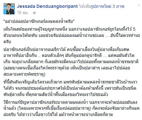 วานนี้ (13 มีนาคม 2558) ผศ.ดร.เจษฎา เด่นดวงบริพันธ์ อาจารย์คณะวิทยาศาสตร์ จุฬาลงกรณ์มหาวิทยาลัย โพสต์ข้อความในเฟสบุ๊กส่วนตัว "Jessada Denduangboripant" ถึงกรณีมีผู้ใจบุญช่วยนำปลาซักเกอร์ปล่อยลงแหล่งน้ำ หลังถูกทิ้งไว้บนถนนให้รถทับ โดยชี้ว่าห้ามปล่อยปลาซักเกอร์ลงแหล่งน้ำเด็ดขาด เพราะเป็นปลาต่างถิ่นที่แพร่พันธุ์ได้รวดเร็วจนคุกคามสัตว์น้ำพื้นเมืองของไทย โดยมีข้อความดังนี้