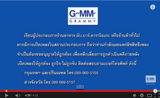 จากกรณีที่บริษัทเจ้าของลิขสิทธิ์เพลงรายใหญ่ของไทย ขึ้นข้อความหลังคลิปมิวสิควิดีโอที่เพิ่งอัพโหลดใหม่ แจ้งเตือนไปยังผู้ประกอบการร้านอาหาร ผับ บาร์ คาราโอเกะ หรือร้านค้าทั่วไป ว่าการเปิดเพลงที่เป็นลิขสิทธิ์ของแกรมมี่ให้ลูกค้าฟังผ่าน Youtube ก็ถือว่าเป็นการละเมิดลิขสิทธิ์ หากต้องการเปิดแบบถูกต้อง จะต้องติดต่อขอสิทธิ์กับทางบริษัท ซึ่งโดยทั่วไปการเปิดผ่าน Youtube จะอนุญาตให้รับชมได้เฉพาะเป็นการส่วนตัวหรือในที่อยู่อาศัยเท่านั้น