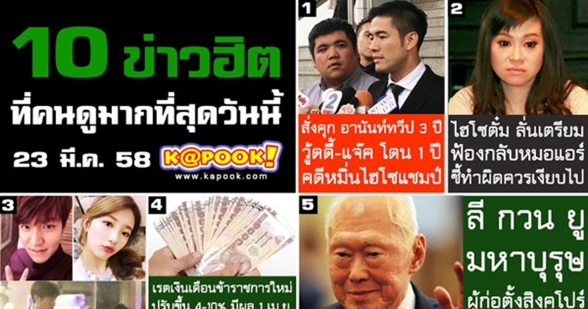 ข่าวฮิตประจำวันนี้ เป็นเรื่องที่จำคุก ชาย อานันทวีป วู้ดดี้ แจ๊ค คดีหมิ่นไฮโซแชมป์ รองลงมาเป็นเรื่อง ลีมินโฮ เดทกับซูจี และข่าวอื่นอีกมากมาย