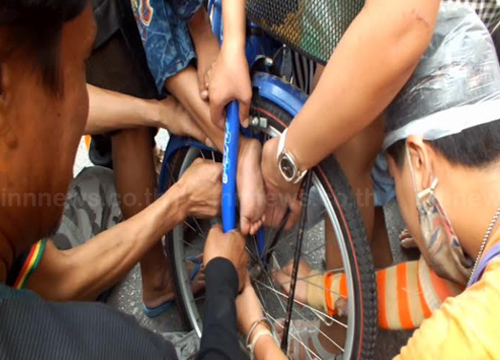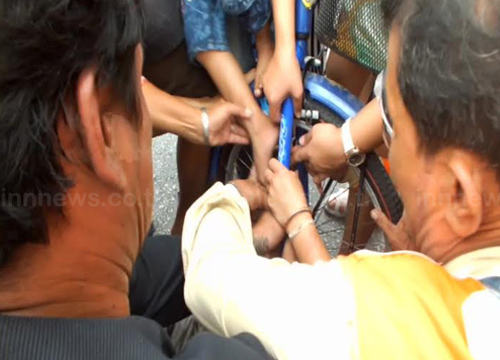 แม่ชาวกัมพูชานำลูกชายวัย 4 ขวบ นั่งเบาะรถด้านหน้าจักรยานปั่นไปตลาด เท้าติดที่ล้อ ชาวบ้าน-กู้ภัยระดมเข้าช่วย