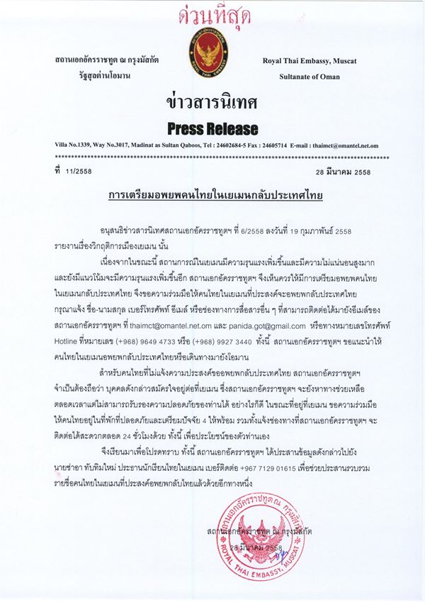 9927 3440 ทั้งนี้ สถานเอกอัครราชทูตฯ ขอแนะนำให้คนไทยในเยเมนอพยพกลั บประเทศไทยหรือเดินทางมายั งโอมาน