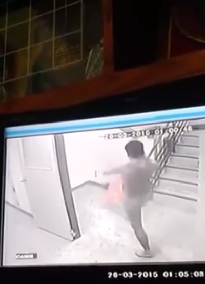 โดยจากเหตุการณ์ดังกล่าว เผยให้เห็นว่าในขณะที่เด็กน้อยอยู่บริเวณบันไดเพียงลำพัง พ่อเลี้ยงก็เดินเข้ามาลากตัวของเด็กน้อย ก่อนจะเตะจนล้ม