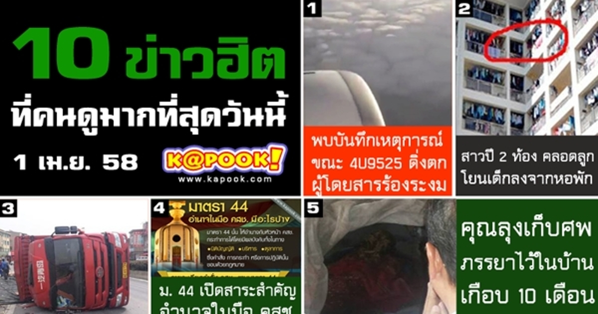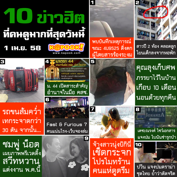 ประเด็นข่าวฮิตวันนี้ ฮอตที่สุดคงหนีไม่พ้นควันหลง 4U9525 ดิ่งตก มีคลิปเหตุการณ์เกิดขึ้น รองลงมาเป็นเรื่อง สาวปี 2 คลอดลูกเสร็จ โยนลูกจากหอพักชั้น 9 เสียชีวิต ส่วนข่าวอื่น ๆ ที่น่าสนใจมีอะไรอีกบ้าง ตามลิสต์ด้านล่างนี้เลย