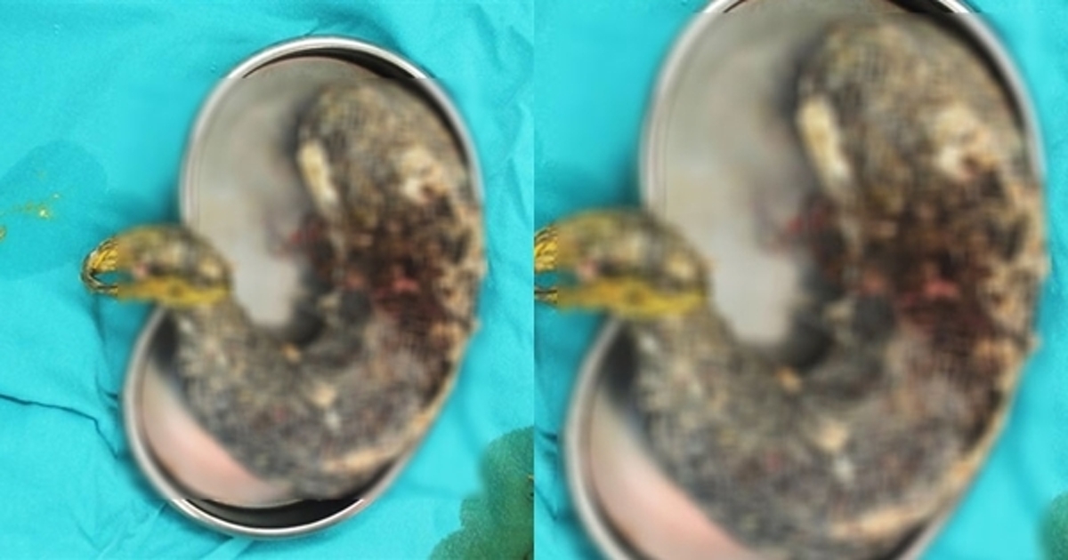 แต่ไม่ว่ามันจะเป็นอะไร เมื่อมันทำให้เธอทานอะไรไม่ได้ อาเจียนออกมาหมด แพทย์จึงจำเป็นต้องผ่าตัดก้อนปริศนานั้นออกมา และพบว่ามันคือก้อนผมหนัก 2 กิโลกรัม ที่ปะปนกับเศษเล็บ รวมถึงเส้นใยเสื้อผ้าด้วย !!! ซึ่งแสดงให้เห็นว่าเธอทานมันเข้าไป และทานเป็นนิสัยกินเวลานานหลายปีแล้ว
