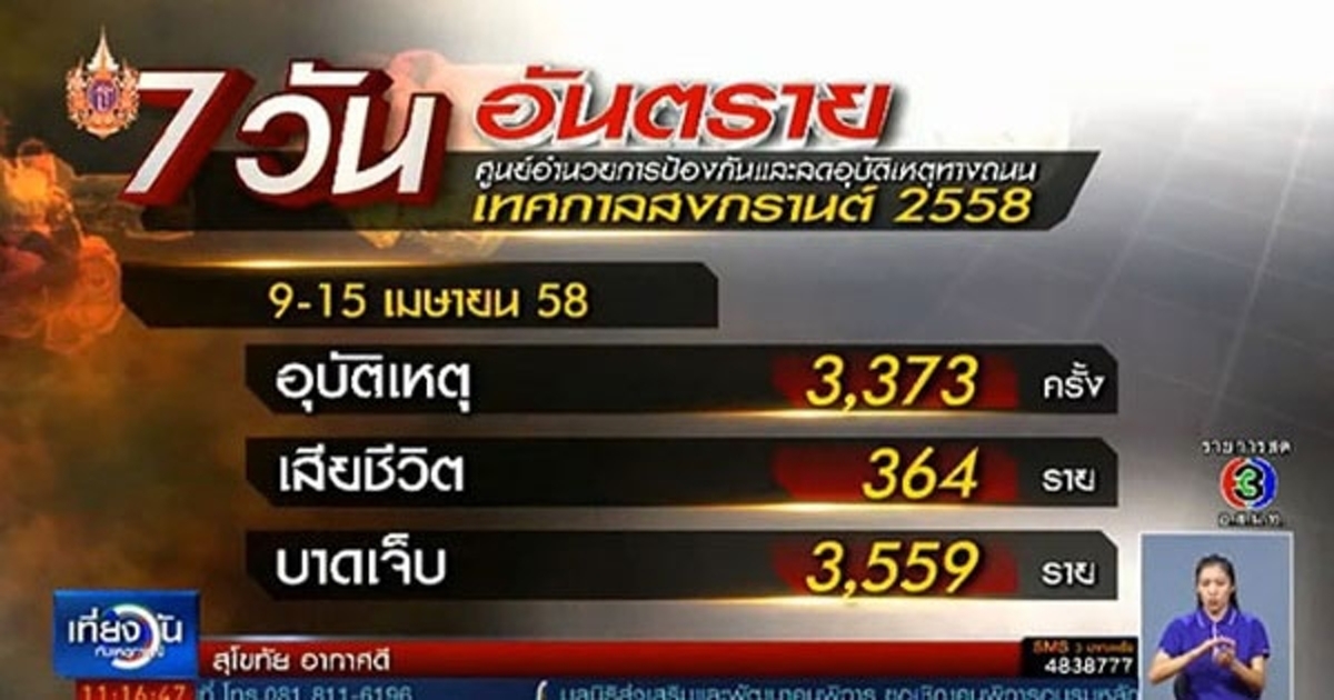 สถิติยอดรวม 7 วันอันตราย 2558 เกิดอุบัติเหตุรวม 3,373 ครั้ง ยอดผู้เสียชีวิตรวม 364 ราย ทำลายสถติปี 57 ตาย 326 ราย สาเหตุหลักเกิดจากเมาแล้วขับ