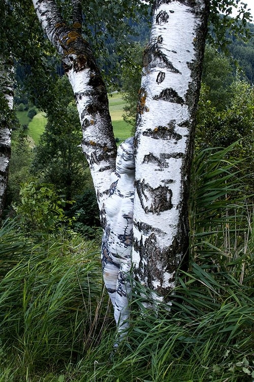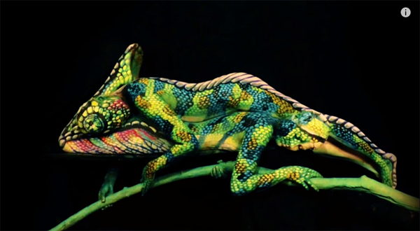 เอาล่ะ ลองเพ่งดี ๆ เพ่งใกล้ ๆ เริ่มมองเห็นแล้วหรือยังว่า เจ้ากิ้งก่าสีสดที่เกาะกิ่งไม้อยู่ตัวนี้ แท้จริงคือผลงานบอดี้เพนท์ระดับเนียนขั้นเทพบนตัวนางแบบ 2 คน ที่นอนพาดทับกันอยู่ข้างบนคนข้างล่างอีกหนึ่งคนไงล่ะ !!