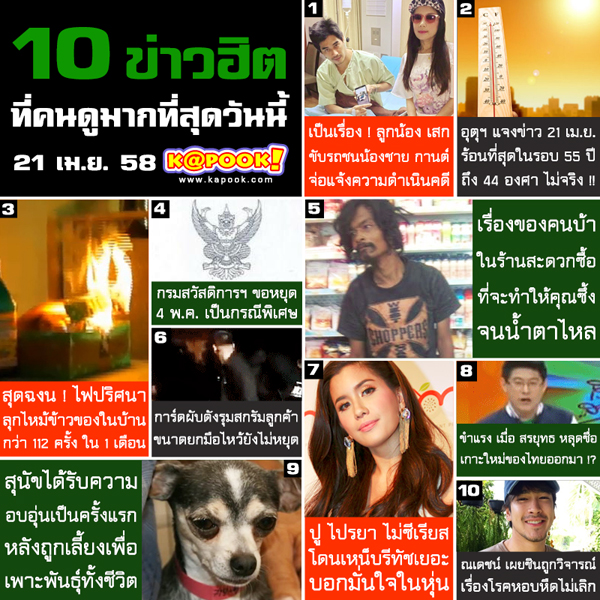 ข่าวฮิตประจำวันที่ 21 เมษายน 2558 กับข่าวลูกน้อง เสก โลโซ ขับรถชนน้องชาย กานต์ วิภากร เร่งนำตัวส่งโรงพยาบาล หรือข่าวอุตุฯ แจงข่าว 21 เม.ย. ร้อนเดือดที่สุดในรอบ 55 ปี 44 องศา !!