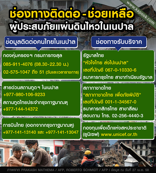 - รัฐบาลเชิญชวนพี่น้องชาวไทยร่วมส่งน้ำใจไปช่วยผู้ประสบภัยที่เนปาล โดยสามารถบริจาคเงินผ่านทางบัญชี หัวใจไทย ส่งไปเนปาล ธนาคารกรุงไทย สาขา ทำเนียบรัฐบาล หมายเลขบัญชี 067-0-10330-6