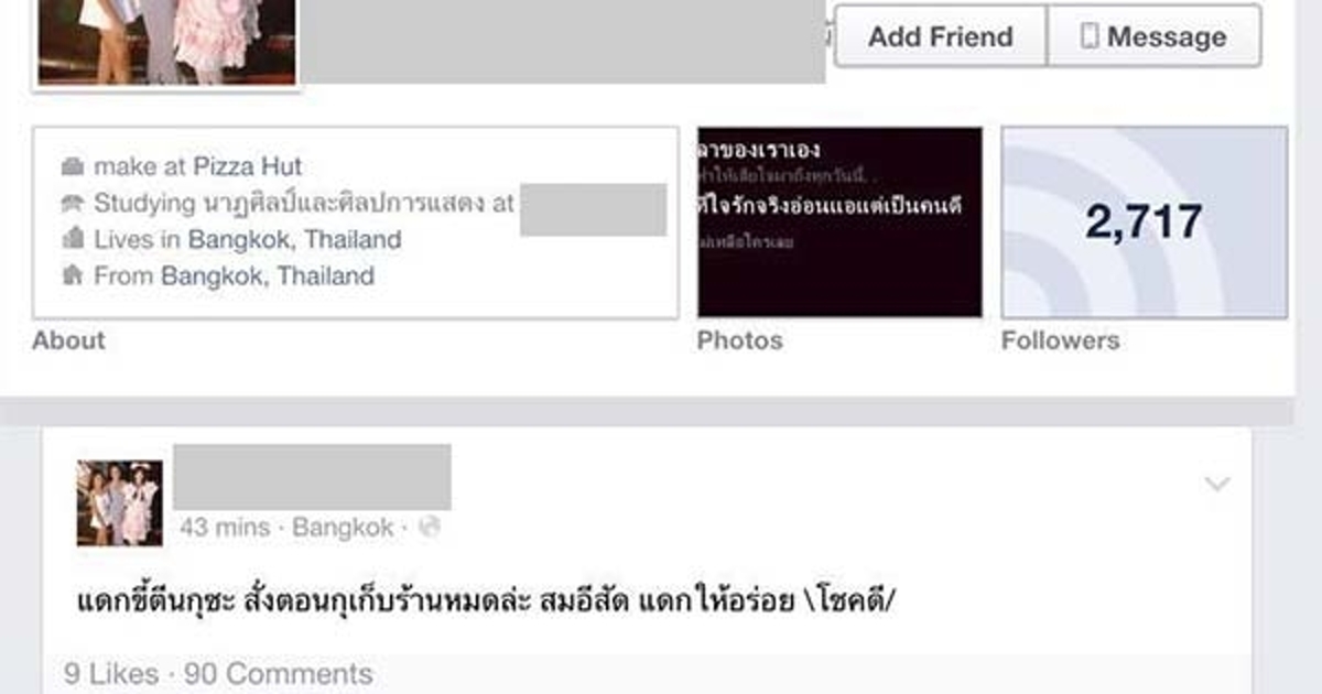 สำหรับข้อความที่พนักงานสาวคนดังกล่าว โพสต์ผ่านเฟซบุ๊กมีดังนี้ "แดกขี้ตีนกุซะ สั่งตอนกุเก็บร้านหมดล่ะ แดกให้อร่อย โชคดี"
