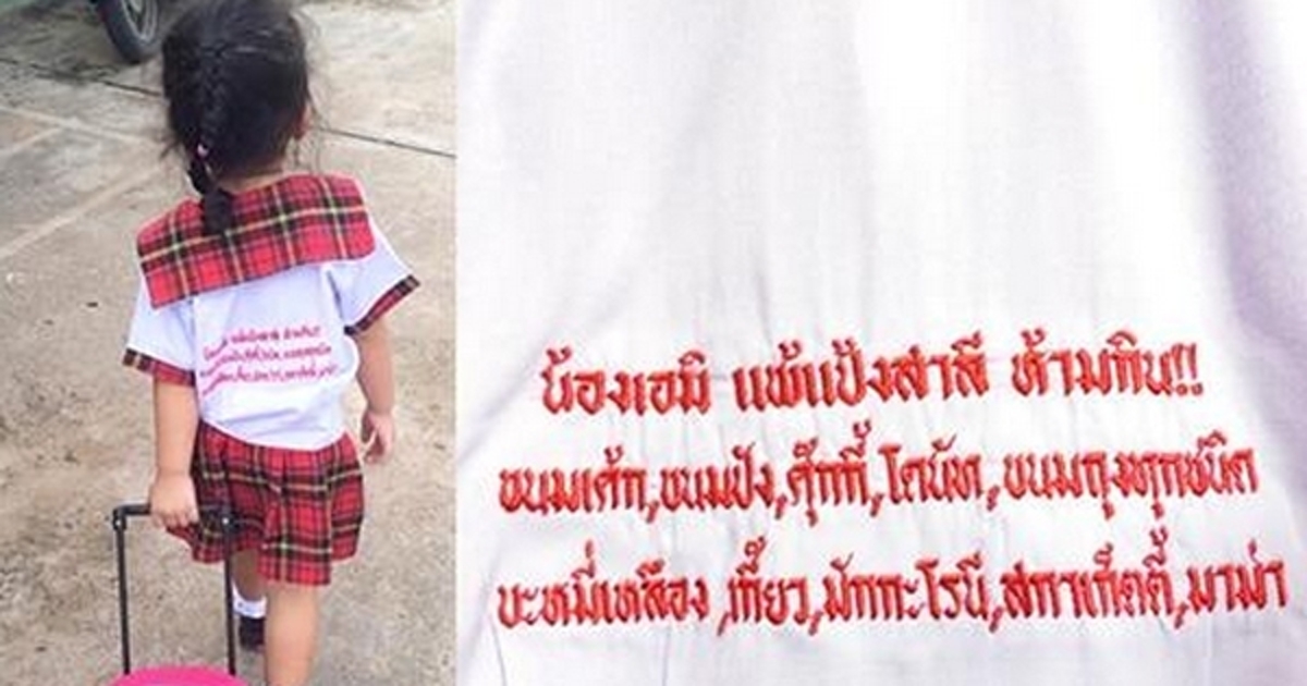 เผยภาพเด็กนักเรียนหญิง สวมเสื้อปักข้อความด้านหลังถึงรายการอาหารที่ตัวเด็กแพ้-กินไม่ได้ ชาวเน็ตมาเห็นแห่ชื่นชมไอเดียคุณแม่ ว่าทำถูกต้อง และรอบคอบที่สุด