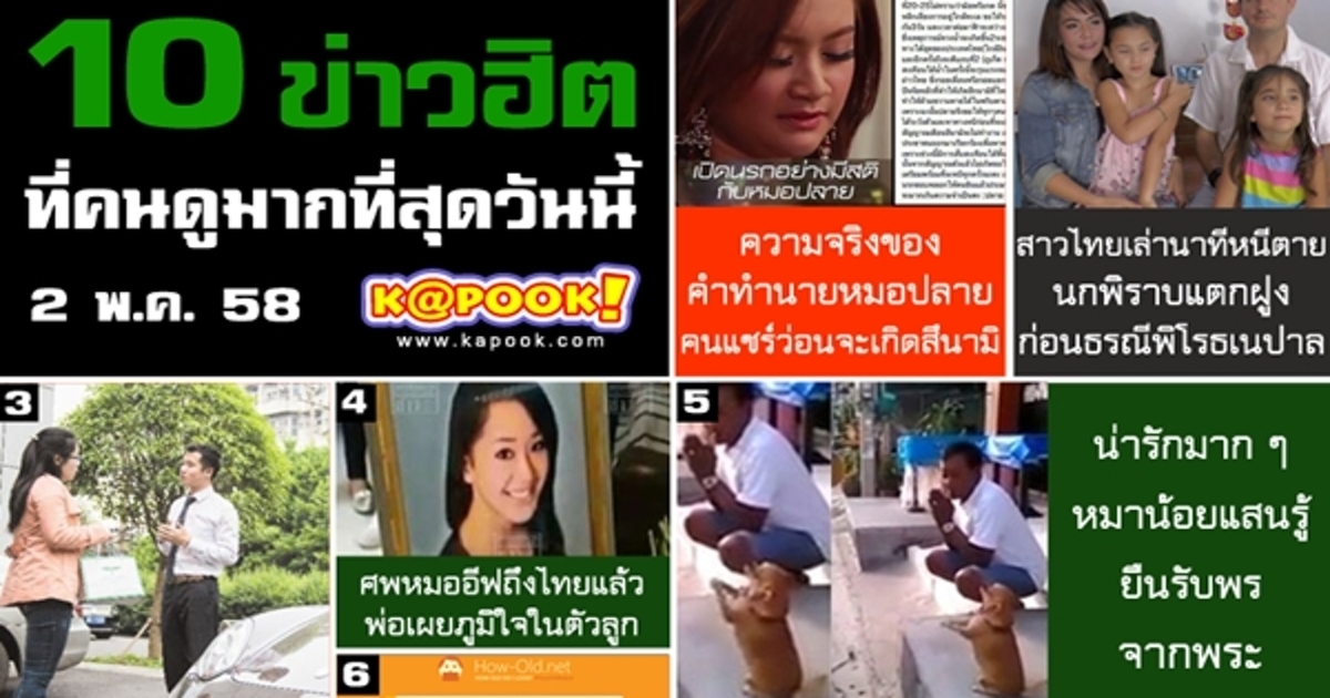 ข่าวฮิตวันที่ 2 พฤษภาคม 2558 เรื่องคำทำนายของหมอปลายเกี่ยวกับสึนามิ ความจริงที่ทุกคนควรรู้ และเรื่องของสาวไทย ที่หนีตายจากเหตุการณ์แผ่นดินไหวที่เนปาล โดยที่เธอบอกว่า ก่อนเกิดเหตุ เห็ยฝูงนกพิราบแตกฮือ