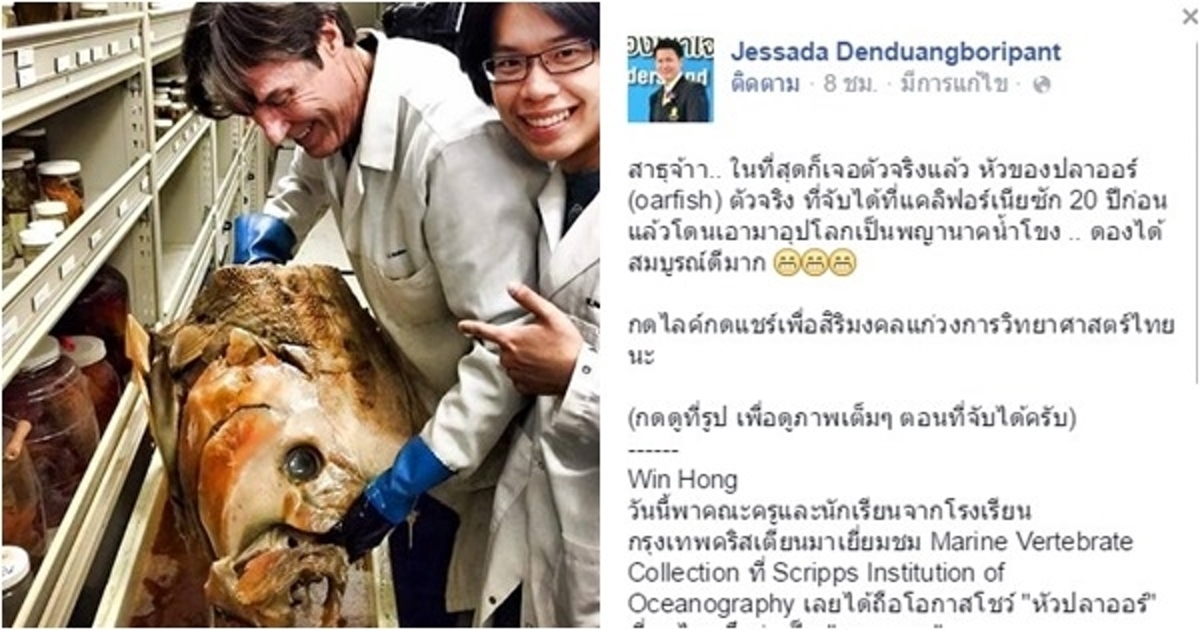 "สาธุจ้าา.. ในที่สุดก็เจอตัวจริงแล้ว หัวของปลาออร์ (oarfish) ตัวจริง ที่จับได้ที่แคลิฟอร์เนียซัก 20 ปีก่อน แล้วโดนเอามาอุปโลกเป็นพญานาคน้ำโขง .. ดองได้สมบูรณ์ดีมาก