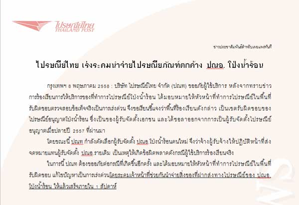 ทั้งนี้ล่าสุดในวันที่ 8 พฤษภาคม 2558 บริษัท ไปรษณีย์ไทย จำกัด (ปณท.) ได้ส่งหนังสือชี้แจงถึงกรณีที่เกิดขึ้น โดยระบุว่า ปณท. ได้มอบหมายให้หัวหน้าที่ทำการไปรษณีย์ในพื้นที่รับผิดชอบตรวจสอบข้อเท็จจริงเป็นการเร่งด่วนแล้ว พบว่าพื้นที่ร้องเรียนดังกล่าว เป็นเขตรับผิดชอบของไปรษณีย์อนุญาตโป่งน้ำร้อน ซึ่งเป็นของผู้รับจัดตั้งเอกชน และได้ขอลาออกจากการเป็นผู้รับจัดตั้งไปรษณีย์อนุญาตเมื่อปลายปี 2557 โดยขณะนี้ ปณท. กำลังคัดเลือกผู้รับจัดตั้ง ปณอ.โป่งน้ำร้อนคนใหม่ จึงว่าจ้างผู้รับจ้างให้ปฏิบัติหน้าที่ส่งจดหมายแทนผู้รับจัดตั้ง ปณอ.รายเดิม จนเป็นเหตุให้เกิดข้อผิดพลาดดังที่ถูกร้องเรียนขึ้น
