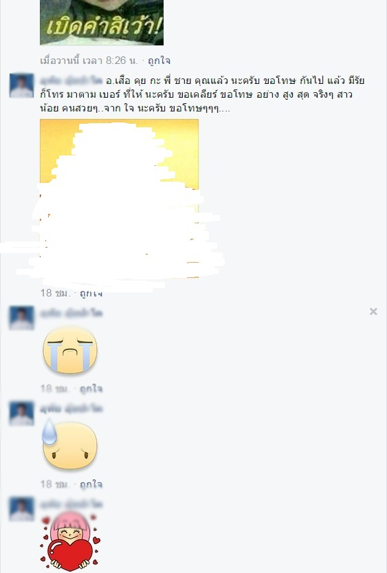 เราได้ไปคอมเม้นท์ใต้ภาพขอให้เขาลบรูปค่ะ แต่ไม่มีการตอบกลับใด ๆ จนกระทั่ง 4 โมงเย็นเราทนไม่ไหว จึงไปแจ้งความเรียบร้อยแล้ว