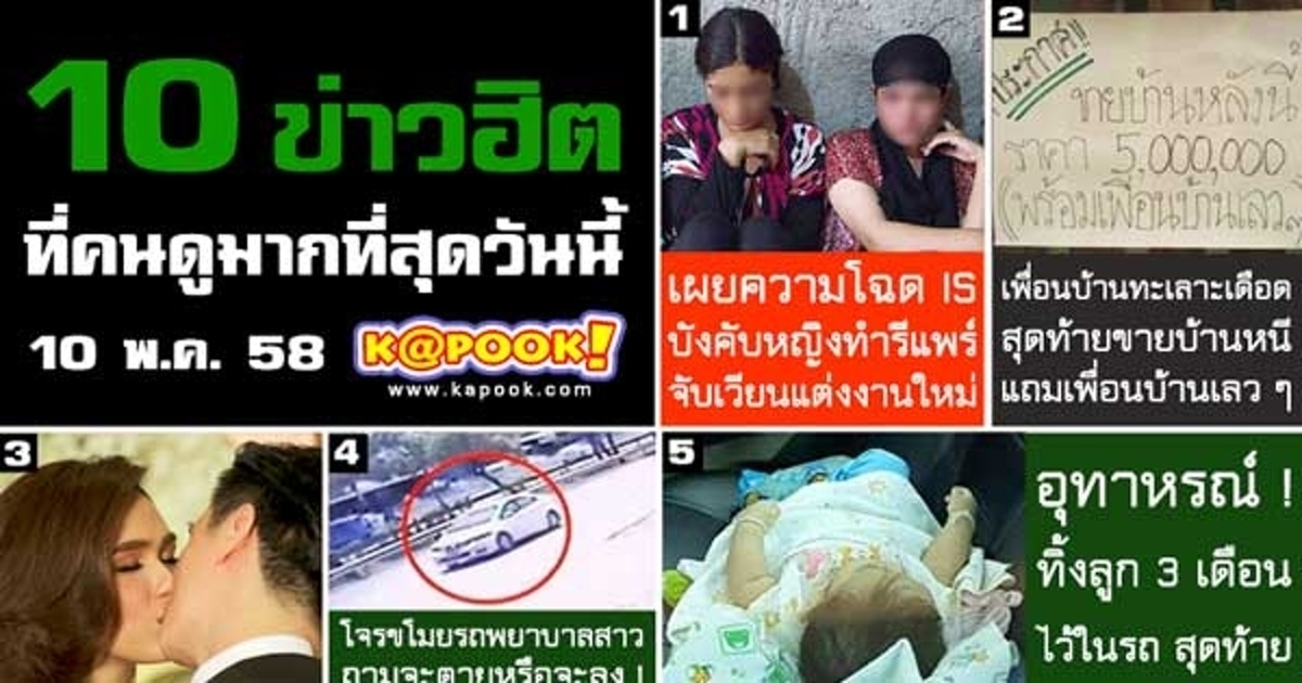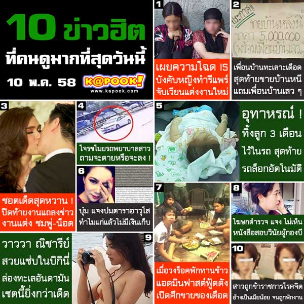 ข่าวฮิตประจำวันที่ 10 พฤษภาคม 2558 มาตามติดภาพบรรยากาศฉลองงานแต่ง ชมพู่ น็อต และความคืบหน้าเรื่อง ผู้กองบี ว่าจะถูกสั่งสอบวินัยกรณีเครื่องแต่งกายหรือไม่ พร้อมด้วยข่าวที่น่าสนใจอื่น ๆ