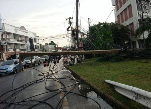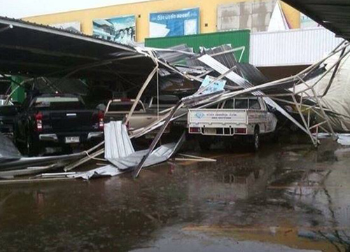 พายุถล่มมหาสารคาม หลังคาโรงจอดรถของห้างโกลบอลเฮ้าส์พังทับรถกว่า 30 คัน ขณะที่ อ.วาปีปทุม พบชาวบ้านถูกฟ้าผ่าดับ 2 ราย บาดเจ็บอีก 7 ราย