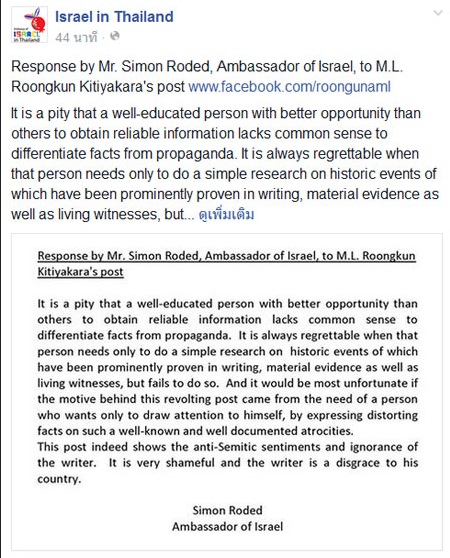 ล่าสุด นายซีมอน โรเด็ด เอกอัครราชทูตอิสราเอลประจำประเทศไทย ได้ออกมาชี้แจงผ่านแฟนเพจเฟซบุ๊ก Isarael in Thailand ระบุว่า น่าเสียดายที่คนที่น่าจะได้รับการอบรม มีโอกาสมากกว่าคนอื่น แต่กลับไม่มีวิจารณญาณที่จะแยกแยะได้ การเขียนเรื่องในทางประวัติศาสตร์เพื่อบิดเบือนข้อเท็จจริงด้วยอัตวิสัยส่วนตัว ทำให้ประเทศนี้เสียหายยิ่ง บ่งชัดถึงความเขลาในเรื่องการเหยียดเชื้อชาติจากคนเพียงคนเดียว