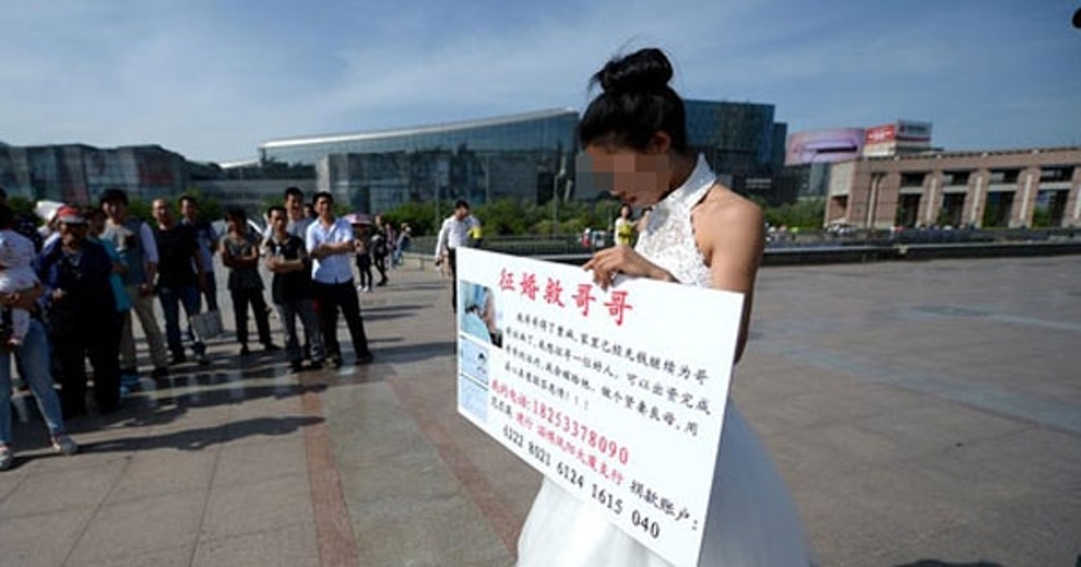 เมื่อวันที่ 14 พฤษภาคม 2558 เว็บไซต์ไชน่าเดลี่ รายงานว่า หญิงสาวคนหนึ่งในชุดแต่งงาน ได้ยืนถือป้ายที่จัตุรัสกลางเมืองจี้หนาน โดยที่ในป้ายนั้นระบุว่า เธอพร้อมแต่งงานกับใครก็ได้ ที่มีฐานะทางการเงินที่ดีพอที่จะช่วยสนับสนุนค่าพยาบาลให้กับพี่ชายของเธอ ซึ่งกำลังป่วยด้วยโรคร้าย