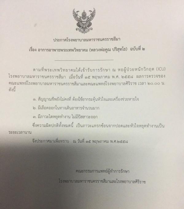 ในเวลาต่อมา ทางคณะแพทย์ รพ.มหาราชนครราชสีมา ได้ออกแถลงการณ์อาการอาพาธของหลวงพ่อคูณ ฉบับที่ 1 ระบุว่า จากการประเมินพบว่า มีลมรั่วในปอดด้านซ้ายและมีเสมหะอุดกั้นทางเดินหายใจ ขณะนี้พักรักษาตัวในหอพักผู้ป่วยวิกฤต (ICU) โดยมีคณะแพทย์ พยาบาล ดูแลอย่างใกล้ชิด เนื่องจากสัญญาณชีพจรยังไม่คงที่ จึงขอประชาชนงดเยี่ยมอาการอาพาธ