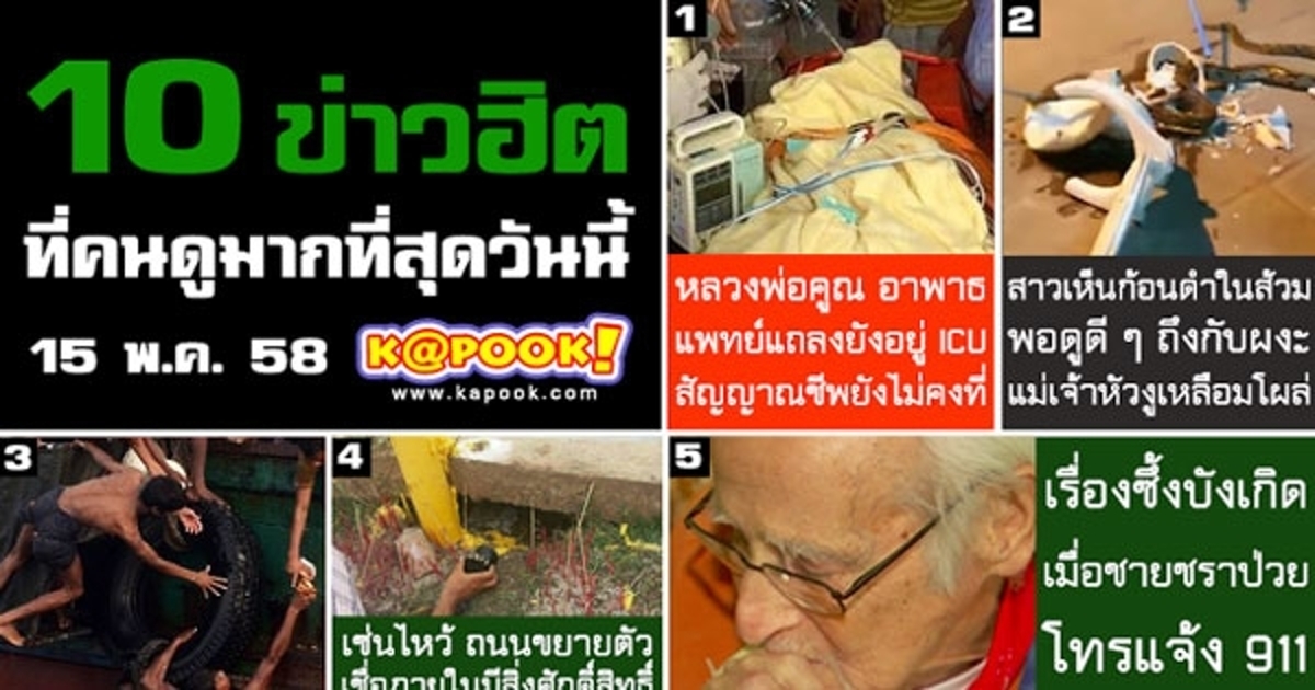 ข่าวฮิตประจำวันนี้ เรื่มต้นด้วยข่าว หลวงพ่อคูณ หยุดหายใจ แพทย์แถลงยังอยู่ ICU สัญญาณชีพยังไม่คงที่ ตามมาด้วย สาวเห็นก้อนดำในชักโครกคิดว่าอึ พอดูดี ๆ ถึงกับผงะ แม่เจ้าหัวงูเหลือมโผล่ ส่วนข่าวอื่น ๆ ที่น่าสนใจ มีดังนี้